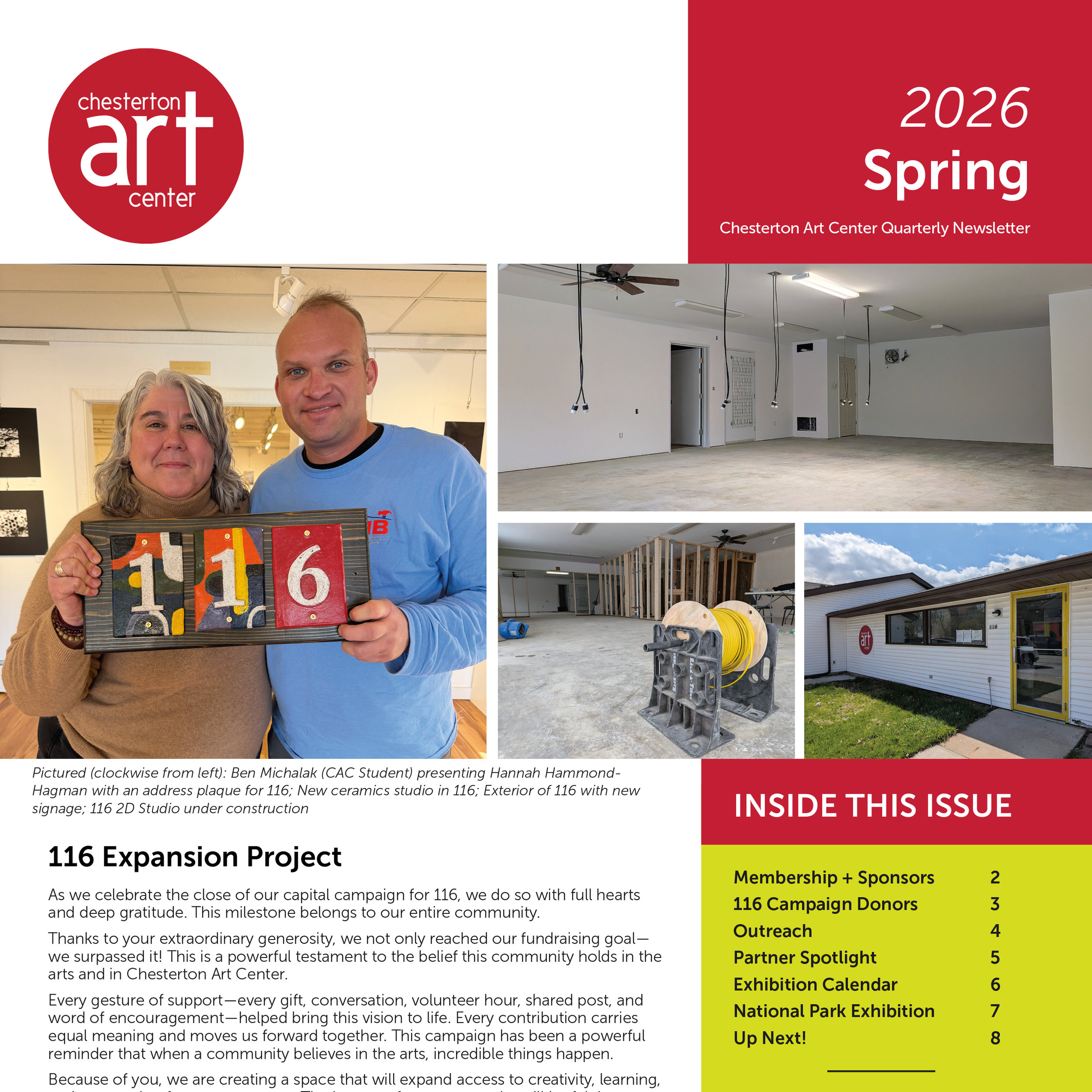 Chesterton Art Center’s quarterly newsletter containing information about exhibitions, outreach, and events.